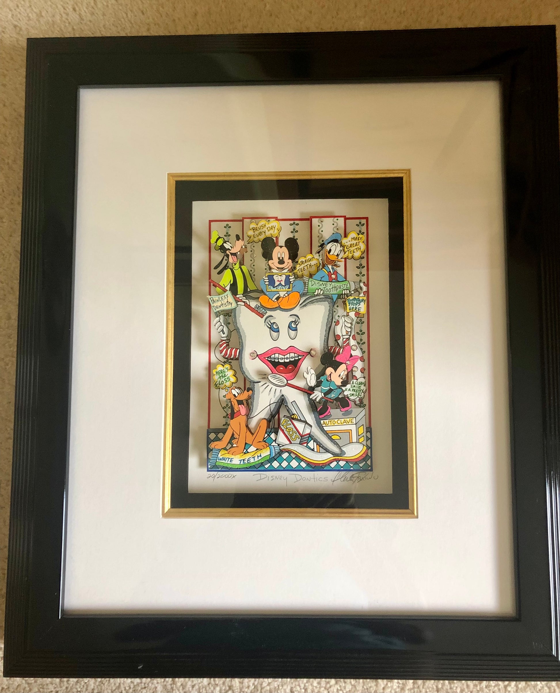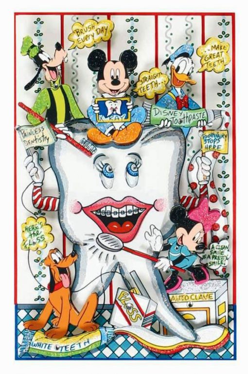 This is the long sold out and very collectible Orthodontic themed Disney Limited Edition by Charles Fazzino. Published in 2003 this edition sold out with 2 years and rarely comes up for sale. There was only a single 200 piece deluxe edition of this image produced by Fazzino. Currently listed on Fazzino’s sold out price list for $2500