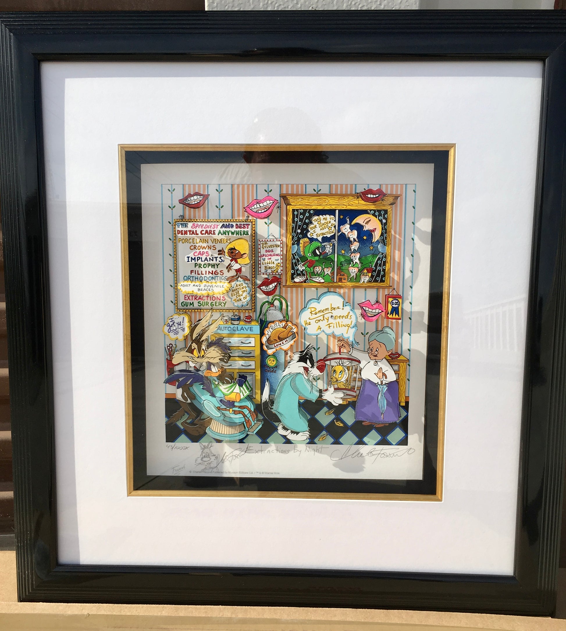 Framed size 20" x 20" as shown with black laquer frame, white top mat and gold filet.
