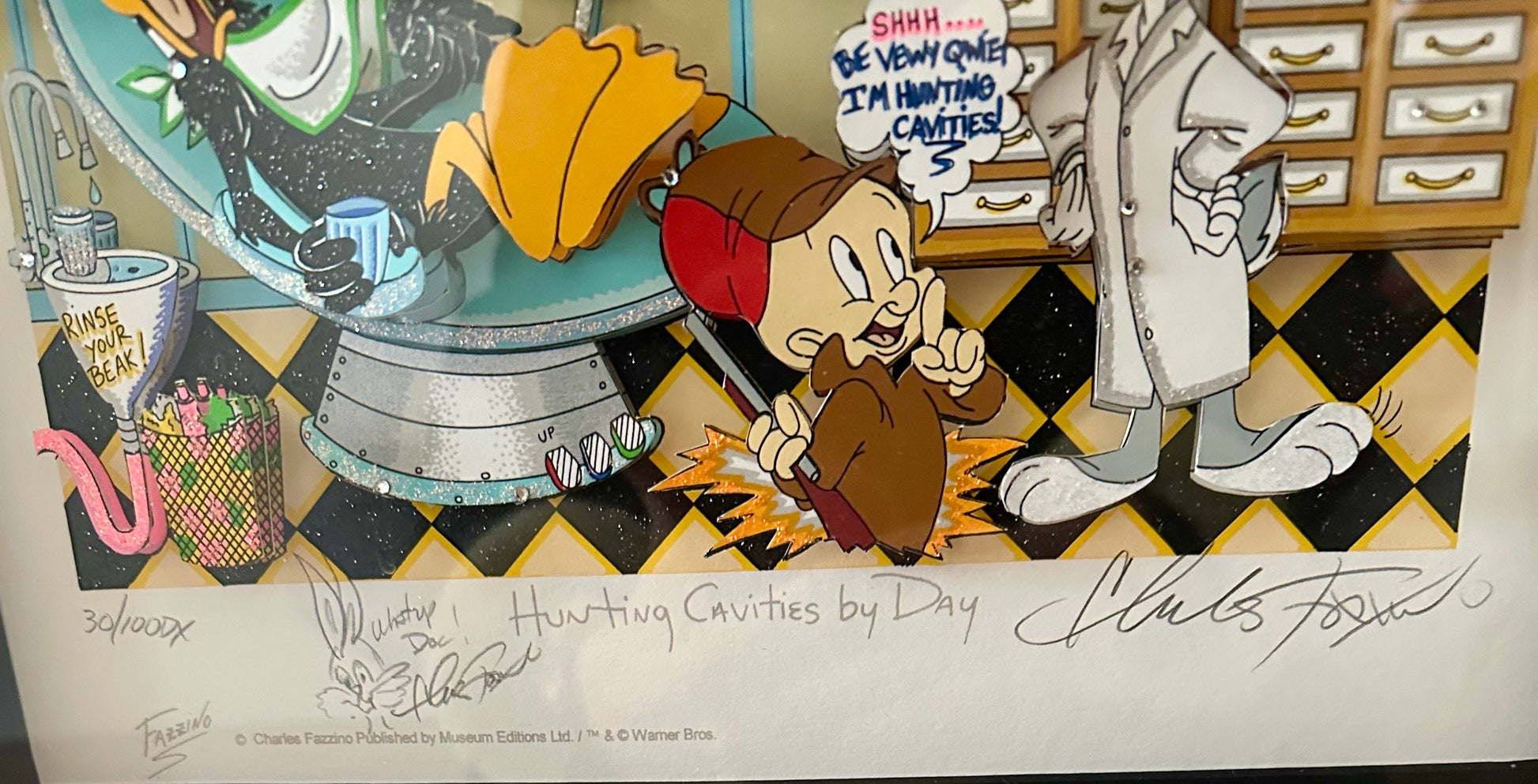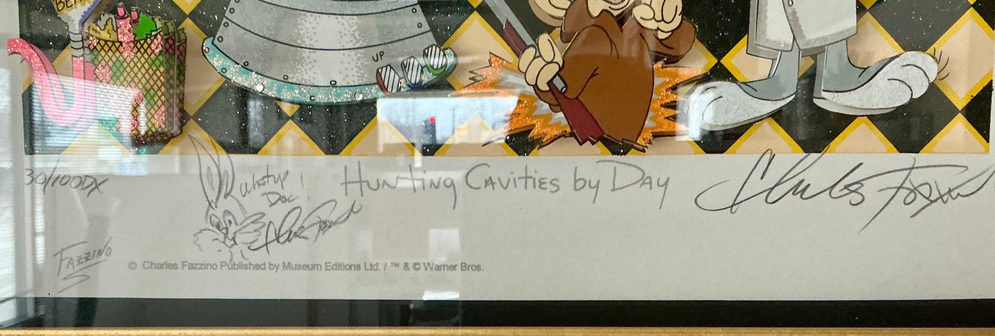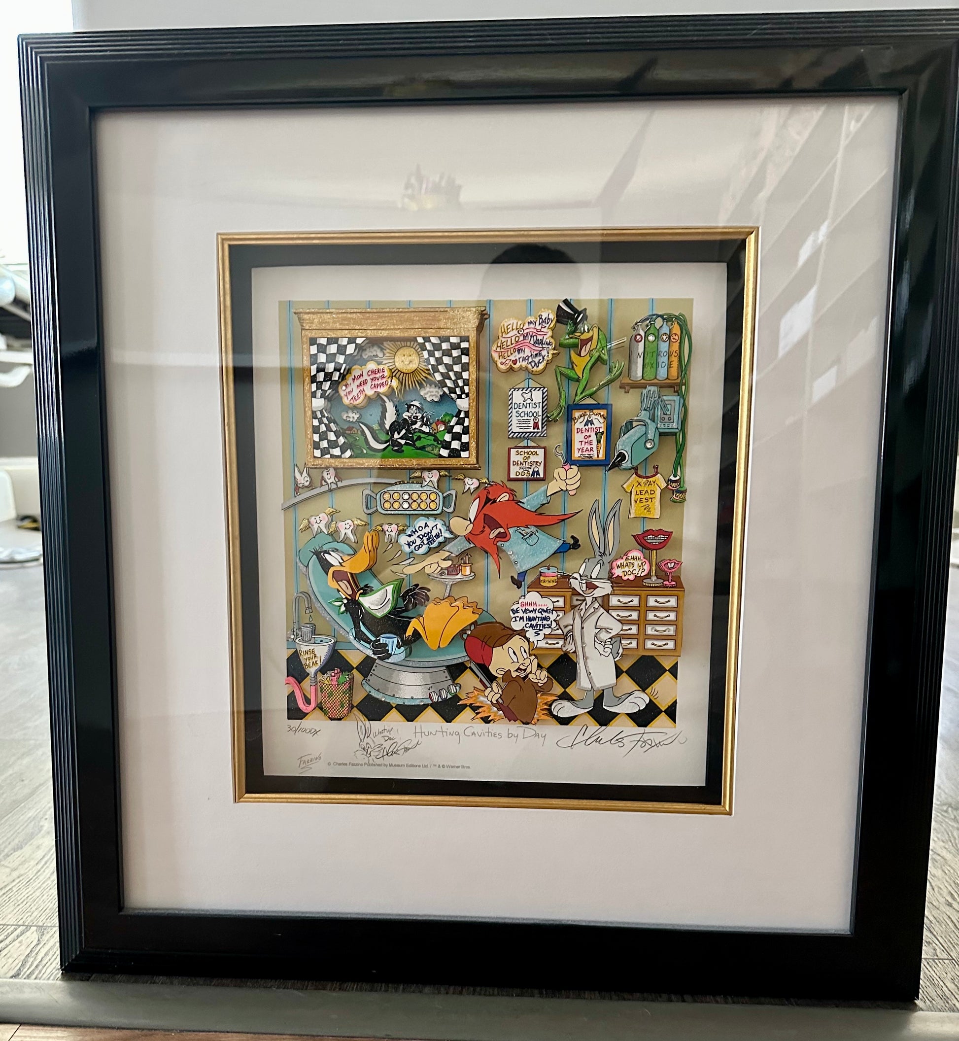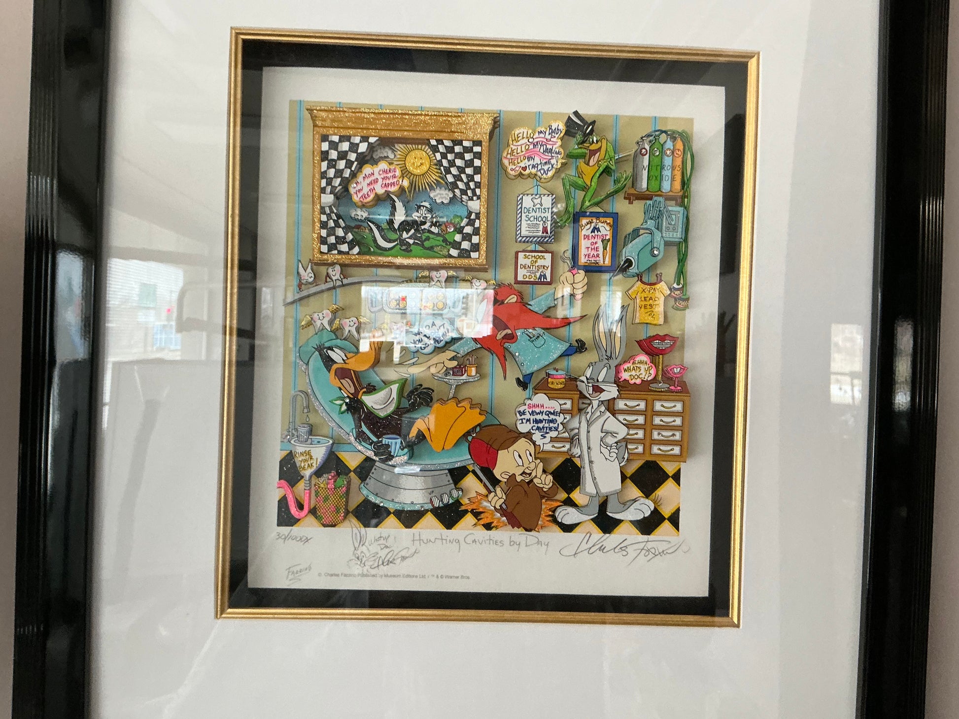 Framed size 20" x 20" as shown with black laquer frame, white top mat and gold filet.