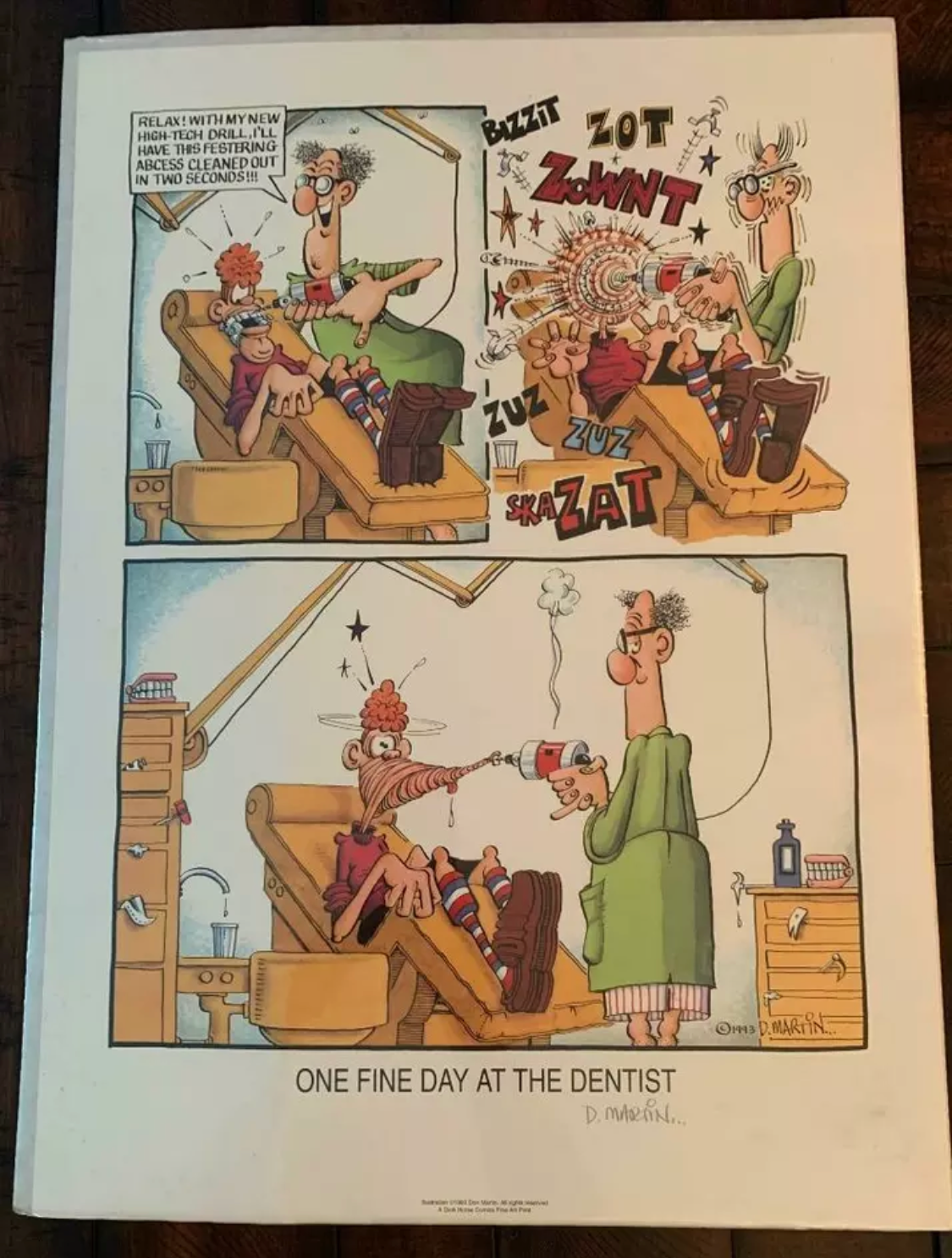 I have been buying and selling dental themed artwork since 2002 and this is only the third “One Fine Day at the Dentist Office” that I have ever run across.