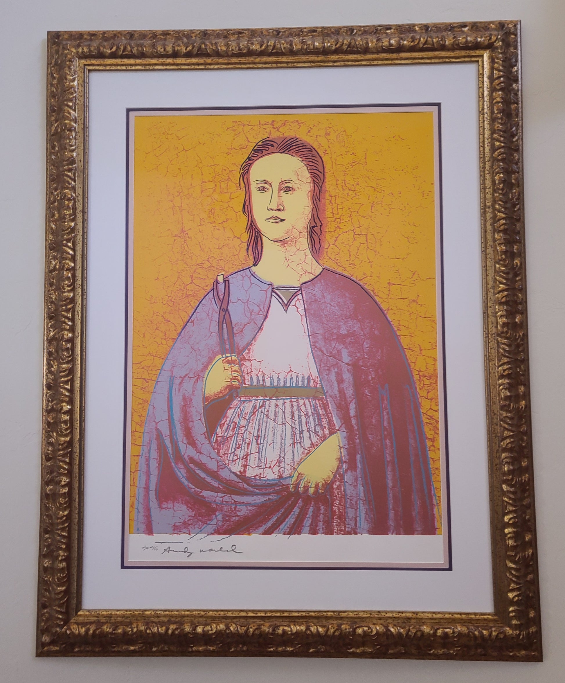 Andy Warhol’s Saint Apollonia, by the “Pope of Pop,” is based on a 15th century Renaissance painting by Piero Della Francesca. In the piece, Saint Apollonia holds a tooth within pincers in reference to her grisly martyrdom in the 3rd century AD. The Patron Saint of dentists and toothaches was an apt choice for Warhol, who was constantly plagued by physical ailments. Andy Warhol was a devout Catholic, which likely contributed to his interest in religious figures in his work