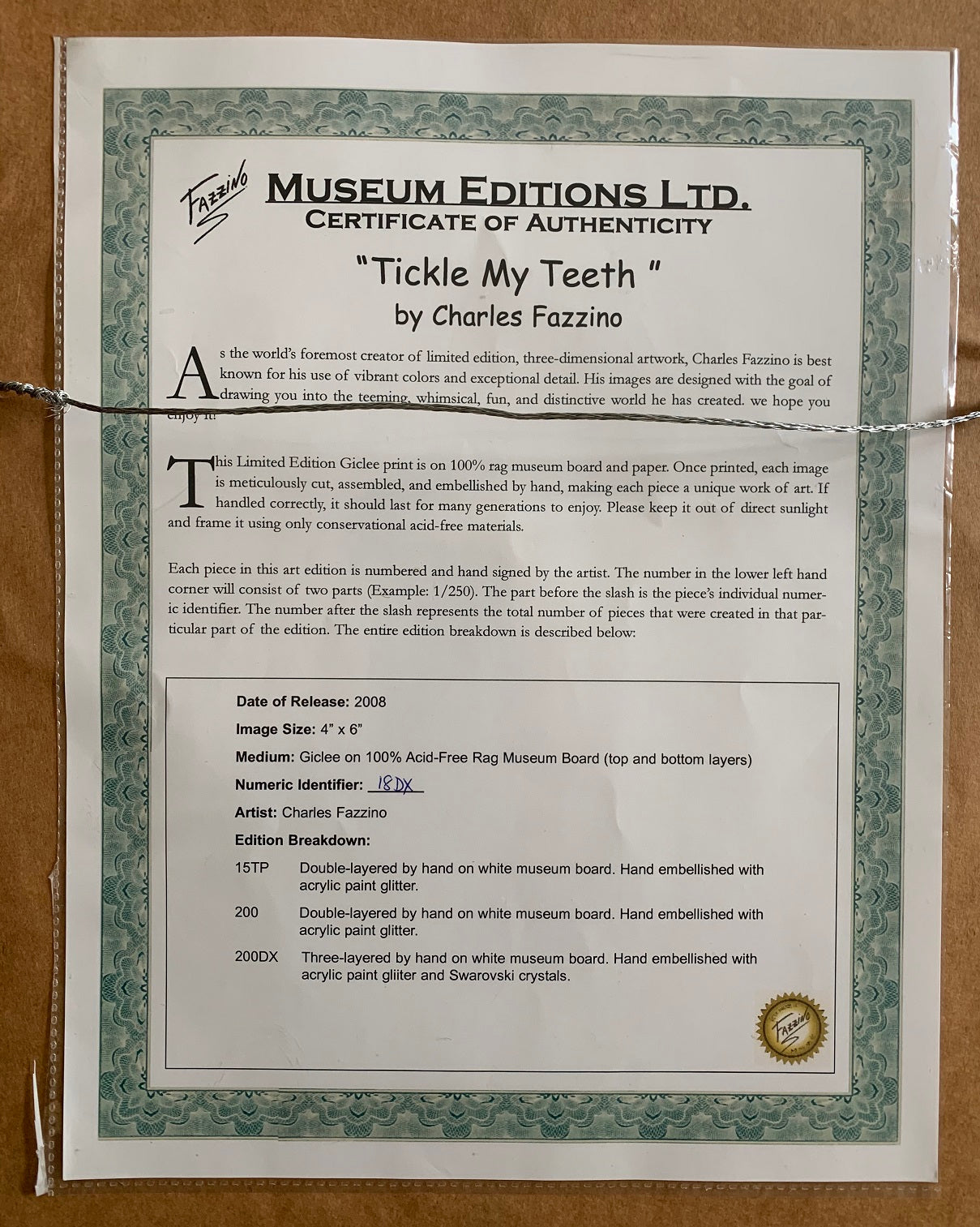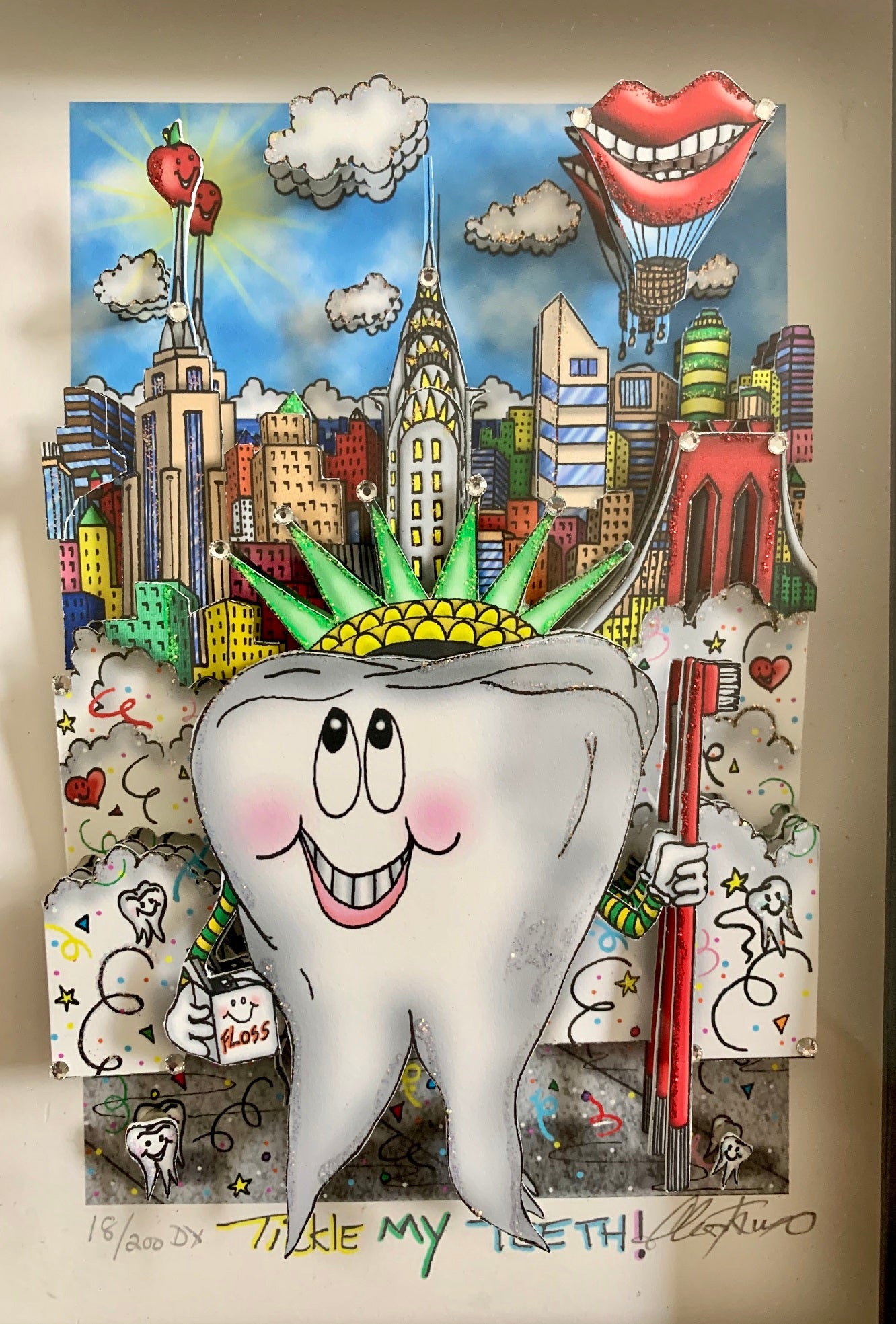 Wonderfully adorable Dental Themed Limited Edition by World Renown 3-D Pop Artist Charles Fazzino. One of the lowest priced of all Fazzino limited editions "Tickle My Teeth, NYC" will make a very special gift for that special dentist or dental assistant in your life.
